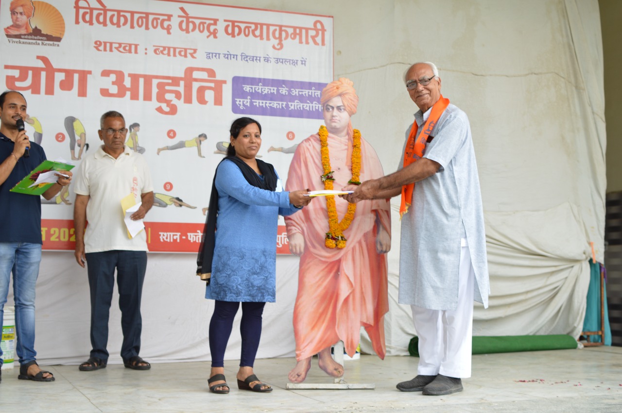 *सूर्य नमस्कार प्रतियोगिता में ब्यावर के नागरिकों ने अकल्पनीय क्षमता का प्रदर्शन किया।* **** आज रविवार, दिनांक 19 जून 2022 को *विवेकानन्द केन्द्र कन्याकुमारी-- शाखा ब्यावर द्वारा फतेहपुरिया बगीची में शहर स्तर पर *योग आहुति* कार्यक्रम के अन्तर्गत "सूर्य नमस्कार प्रतियोगिता" आयोजित की गई। कार्यक्रम के प्रारम्भ में केन्द्र के विभाग संचालक श्री दीपक जी झंवर ने प्रतियोगिता हेतु आव्हान किया। प्रतियोगिता में 83 प्रतिभागियों ने उत्साह पूर्वक भाग लिया। 40 से अधिक प्रतिभागियों ने 75 सूर्य नमस्कार एवं 22 प्रतिभागियों ने 108 सूर्य नमस्कार पूर्ण किए। प्रतियोगिता में युवा वर्ग में सुश्री पूनम प्रथम एवं मोहित द्वितीय स्थान पर रहे, इसी तरह अनुभवी वर्ग में श्री क्षितिज तोषनीवाल प्रथम एवं श्रीमती सोनू अग्रवाल ने द्वितीय स्थान प्राप्त किया। विजेता प्रतिभागियों ने 108 सूर्यनमस्कार का क्वालिफिकेशन राउंड पार करके रेपिड फायर राउंड में सबसे कम समय में 21 सूर्यनमस्कार पूर्ण कर 1100 रुपये प्रथम एवं 500 रुपये द्वितीय स्थान पर रहकर नक़द पुरस्कार जीते। पुरस्कार वितरण श्री लक्ष्मण जी गुरनानी, अमर चंद जी मूंदड़ा, श्री किशनलाल जी जांगिड़ के हाथों से प्रदान किये गये। प्रतियोगिता के संचालन में सभी कार्यकर्ताओं एवं शुभचिंतको ने सहयोग प्रदान किया। भारत स्वाभिमान- पतंजलि योग समिति के स्थानीय सदस्यों का विशेष सहयोग मिला। कार्यक्रम के अंत मे केन्द्र के नगर संचालक श्री जी बी सोनी जी ने सभी का धन्यवाद एवं आभार व्यक्त किया।