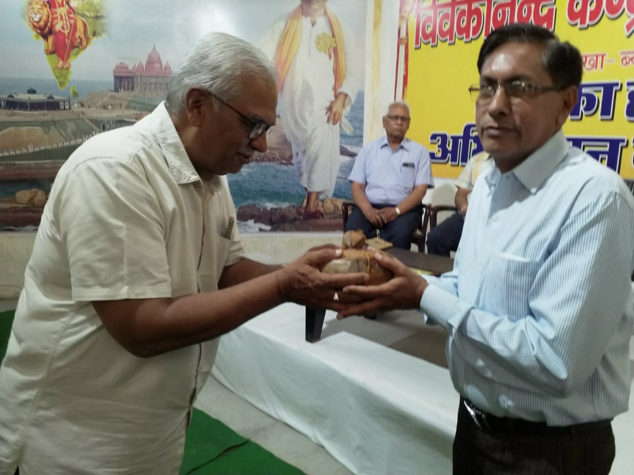 इसी तरह केन्द्र के वरिष्ठ कार्यकर्ता आदरणीय कैलाश नाथ जी शर्मा को विशिष्ट योगदान के लिये साफा,शॉल, श्रीफल के साथ *जीवनपर्यंत उपलब्धि सम्मान स्मृति चिन्ह* से सम्मानित किया गया।