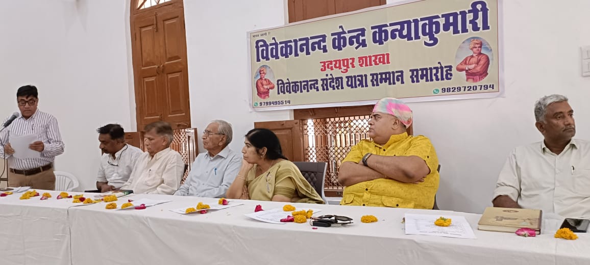 *विवेकानंद संदेश यात्रा सम्मान समारोह* विवेकानंद केंद्र कन्याकुमारी शाखा उदयपुर द्वारा विवेकानंद संदेश यात्रा आयोजन समिति का सम्मान किया गया। *कार्यक्रम की अध्यक्षता डॉ प्रदीप कुमावत कुमावत निदेशक आलोक संस्थान* *, मुख्य अतिथि भगवान सिंह जी राठौड़ प्रांत संगठन राजस्थान,* विशिष्ट अतिथि डॉ राधिका लड्ढा एवं आदरणीय राज भैया, डॉ कृष्णकांत दवे थे। सर्वप्रथम तीन ओंकार, प्रार्थना गीत ,से कार्यक्रम की शुरुआत हुई। स्वागत, एवं *अतिथि परिचय नगर संचालक हिमांशु राय जी नागोरी ने किया।* *आदरणीय भगवान भैया ने युवाओं को केंद्र से जुड़ने तथा पूर्णभाव से कार्य करें सामाजिक क्षेत्र में कार्य करें व्यक्तिगत जीवन की चुनौतियों का सामना करते हुए सामाजिक दायित्व को भी निर्वहन करना चाहिए।* कार्यक्रम की अध्यक्ष *आदरणीय प्रदीप जी कुमावत ने कहा की विवेकानंद अर्थात विवेक + आनंद जो व्यक्ति अपने विवेक को आनंद में परिणित कर देता है वह विवेकानंद कहलाता है राजस्थान की इस माटी का विवेकानंदजी से विशेष नाता है नरेंद्र से विवेकानंद नाम इसी राजस्थान की माटी ने दिया है।*आदरणीय राज भैया ने विवेकानंद संदेश यात्रा के अनुभवों को साझा किया।* विभाग संचालक *जगदीश प्रसाद जी ने केंद्र परिचय दीया* । *रमेश चंद्र कुम्हार ने उदयपुर केंद्र की गतिविधियों से अवगत कराया* कार्यक्रम का *संचालन संजीव भारद्वाज नगर प्रमुख ने किया* अंत में डॉ सुखलेचा ने सभी अतिथियों का धन्यवाद दिया।